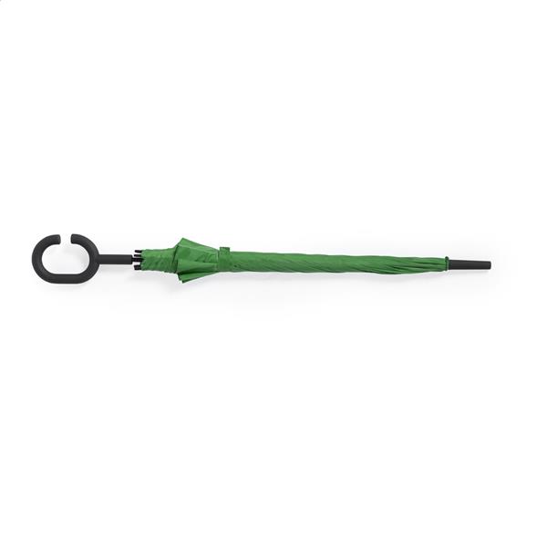 Automatyczny, wiatroodporny parasol z 8 panelami, metalowym trzpieniem i stelażem z włókna szklanego, oraz gumowym uchwytem na ramię. 170T poliester.