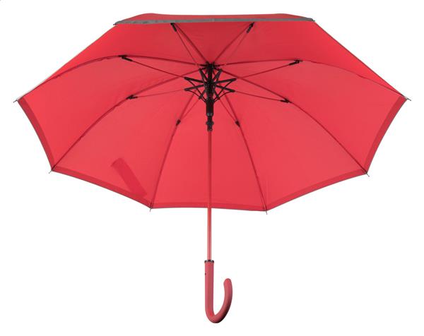 Automatyczny, wiatroodporny parasol 8 panelowy z odblaskową lamówką, gumowaną rączką i stelażem z włókna szklanego. Materiał 190T pongee. Produkt przeznaczony wyłącznie do celów promocyjnych nie kwalifikuje się jako sprzęt ochrony osobistej.