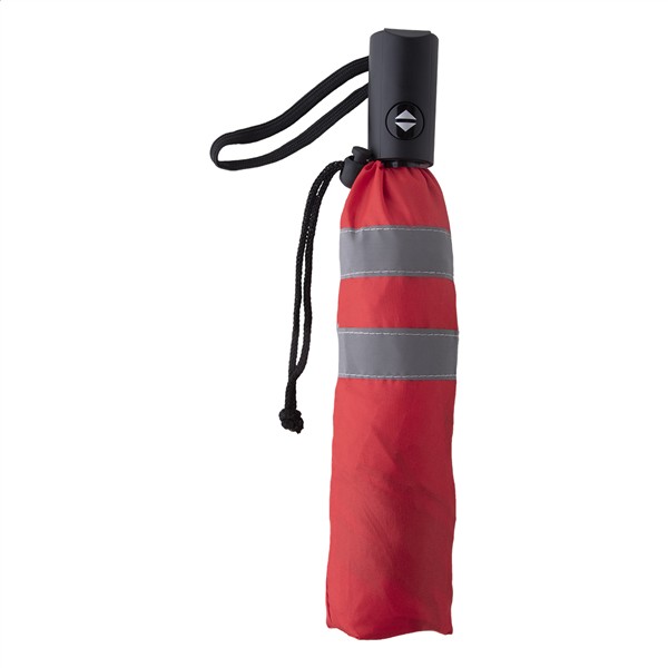 W pełni automatyczny (otwieranie/zamykanie), wiatroodporny parasol z 8 panelami i wykończeniem odblaskowym. Z metalowym trzonem, aluminiową ramą, żebrami z włókna szklanego i plastikowym uchwytem. W dopasowanym kolorowym etui z odblaskowymi pasami. 190T pongee. Produkt przeznaczony wyłącznie do celów promocyjnych nie kwalifikuje się jako sprzęt ochrony osobistej.