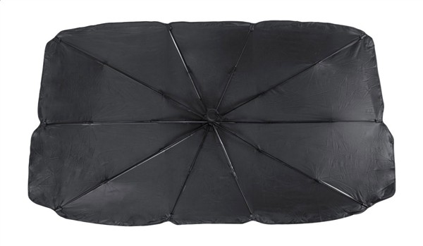 Składany samochodowy parasol przeciwsłoneczny na przednią szybę z metalową ramą. W pokrowcu z poliestru.