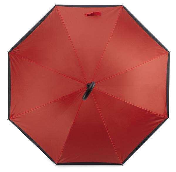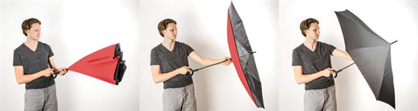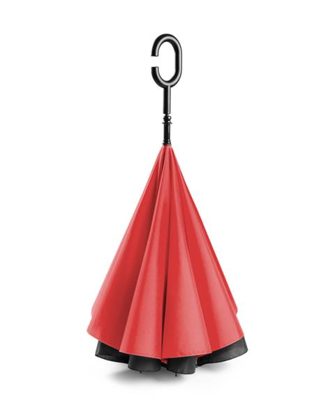Rewolucyjny parasol REVERS wyróżnia się nie tylko kształtem ale też funkcjonalnością. Poprzez odwrócenie ruchu zamknięcia parasola woda, która osadziła się na czaszy pozostaje wewnątrz. Dzięki temu użytkownik oraz otoczenie pozostają suche. Dodatkowo parasol wyróżnia się charakterystyczną rączką, która jest bardzo przydatna w sytuacjach gdy trzeba wykonać czynność obiema rękoma. Dwustronna czasza wykonana z poliestru 190T.
