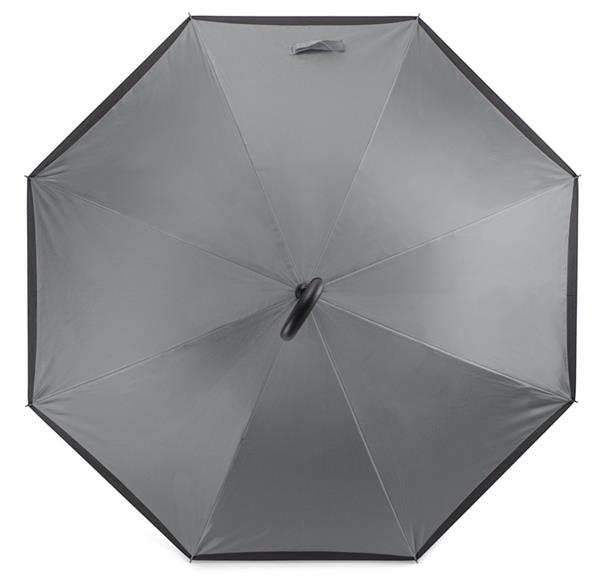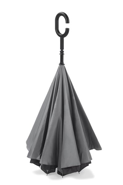 Rewolucyjny parasol REVERS wyróżnia się nie tylko kształtem ale też funkcjonalnością. Poprzez odwrócenie ruchu zamknięcia parasola woda, która osadziła się na czaszy pozostaje wewnątrz. Dzięki temu użytkownik oraz otoczenie pozostają suche. Dodatkowo parasol wyróżnia się charakterystyczną rączką, która jest bardzo przydatna w sytuacjach gdy trzeba wykonać czynność obiema rękoma. Dwustronna czasza wykonana z poliestru 190T.