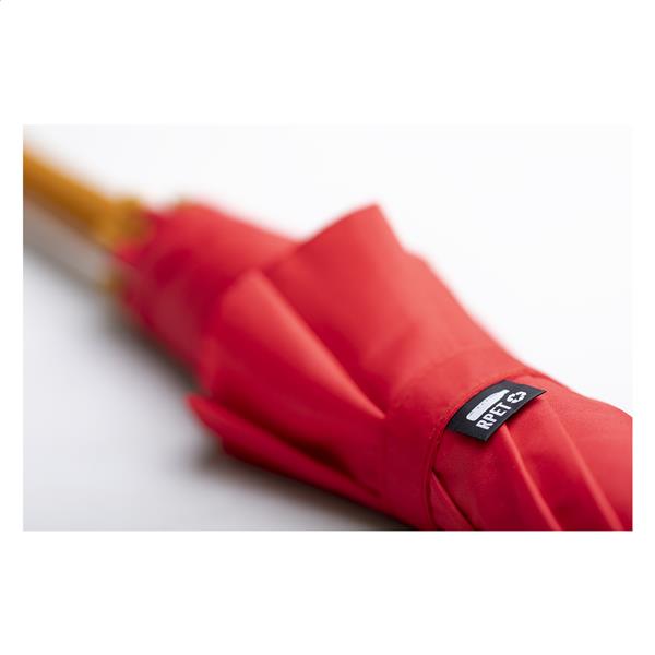 Parasol automatyczny z 8 panelami, metalową ramą, drewnianym trzpieniem i uchwytem. 190T pongee RPET. Z metką RPET.
