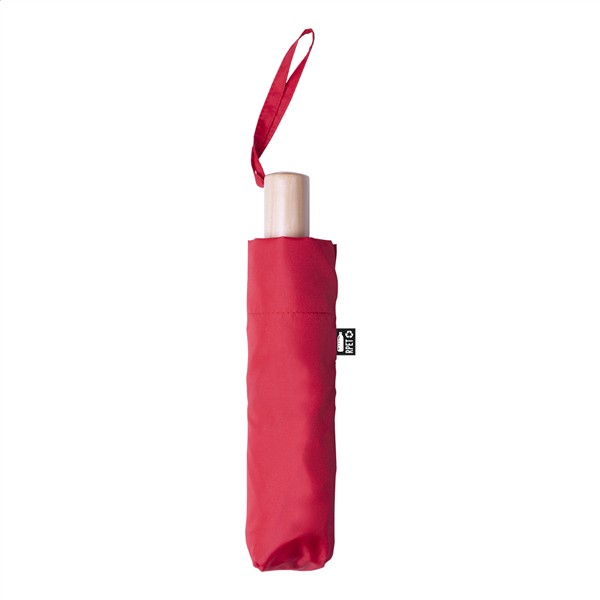 Manualny, składany parasol z 8 panelami z dopasowanym kolorystycznie etui. Z metalową ramą, stelażem z włókna szklanego i drewnianą rączką. Produkt z butelek PET z recyklingu.