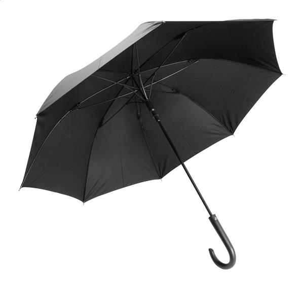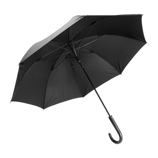 Automatyczny, wiatroszczelny parasol z 8 panelami, ramą z włókna szklanego, metalowym trzonkiem i zakrzywionym uchwytem ABS. 190T RPET pongee. Z charakterystyczną metką RPET.