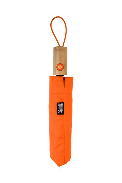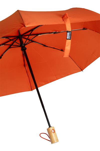 W pełni automatyczny (otwieranie/zamykanie), wiatroszczelny składany parasol z 8 panelami w dopasowanym kolorystycznie etui. Z metalową ramą, żebrami z włókna szklanego i bambusową rączką. Pongee 190T RPET. Z charakterystyczną metką RPET.