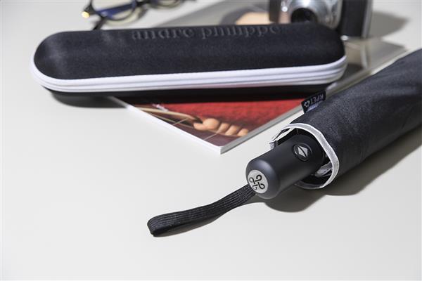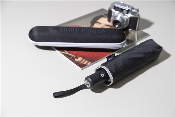W pełni automatyczny (otwieranie/zamykanie), wiatroszczelny, składany parasol z 8 panelami, ze srebrnymi wykończeniami. Z metalową ramą, szynami z włókna szklanego, gumowaną rączką z paskiem na rękę i pokrowcem. Pongee 190T RPET. Z charakterystyczną metką RPET. W firmowym, twardym etui zapinanym na zamek. Produkt marki André Philippe.