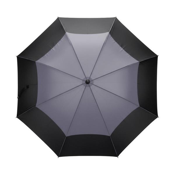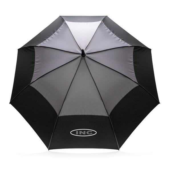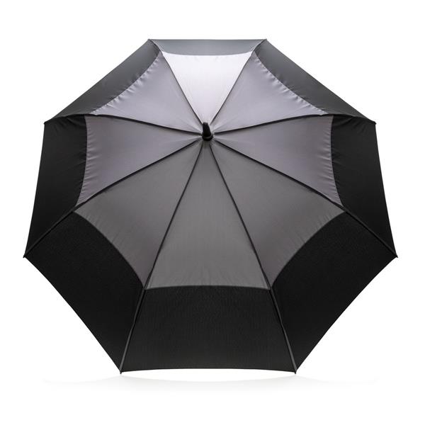 Parasol 27″, sztormowy, automatyczne otwieranie, metalowa rama, żebrowanie z włókna szklanego, uchwyt z PP, panele wykonane z 11,3 poddanych recyklingowi butelek PET (500 ml), dzięki zastosowaniu technologii fizycznych znaczników AWARE™ wykorzystane materiały są identyfikowalne z pochodzenia, 2% wpływów z każdego sprzedanego produktu z kolekcji Impact jest przekazywane na rzecz Water.org