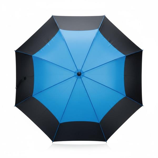 Parasol 27″, sztormowy, automatyczne otwieranie, metalowa rama, żebrowanie z włókna szklanego, uchwyt z PP, panele wykonane z 11,3 poddanych recyklingowi butelek PET (500 ml), dzięki zastosowaniu technologii fizycznych znaczników AWARE™ wykorzystane materiały są identyfikowalne z pochodzenia, 2% wpływów z każdego sprzedanego produktu z kolekcji Impact jest przekazywane na rzecz Water.org