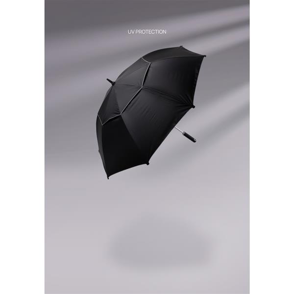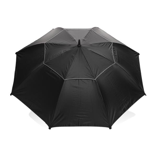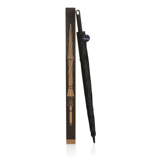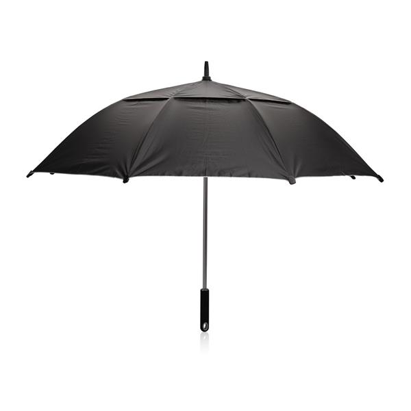 Parasol sztormowy 27”, manualne otwieranie i zamykanie, ochrona UPF50+, dzięki zastosowaniu technologii fizycznych znaczników AWARE™ wykorzystane materiały są identyfikowalne z pochodzenia, 2% wpływów z każdego sprzedanego produktu z kolekcji Impact jest przekazywane na rzecz Water.org, w pudełku upominkowym Swiss Peak z papieru kraftowego z certyfikatem FSC®, ślad węglowy produktu: 3,55 kg CO2