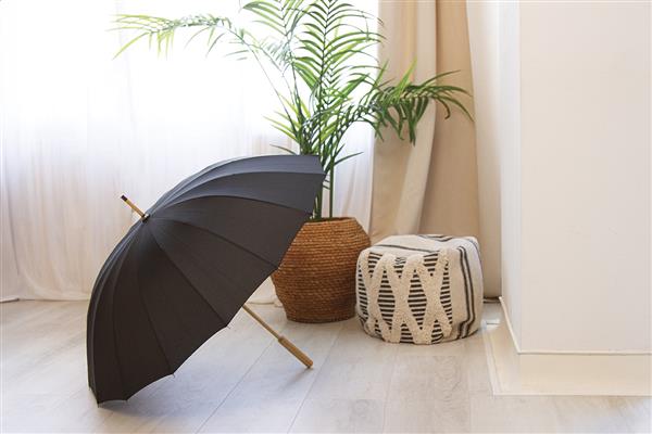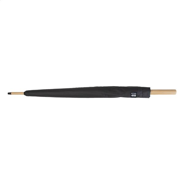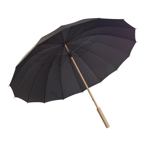Ręczny, wiatroodporny parasol z 16 panelami, bambusową rączką i trzpieniem, ramą i żebrami z włókna szklanego. W dopasowanym kolorystycznie etui. Pongee 190T RPET. Z charakterystyczną metką RPET.