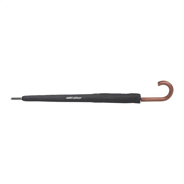Automatyczny, wiatroszczelny parasol w czarno-szare paski z 8 panelami, drewnianą rączką, metalowym trzpieniem i żebrami z włókna szklanego. Ponge 190T. W markowym etui. Produkt marki André Philippe.
