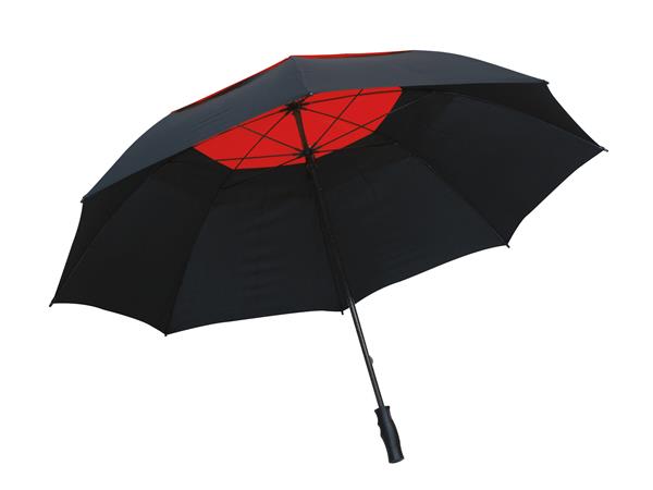 Parasol typu golf MONSUN. Poszycie z nylonu 190 T z systemem wentylacyjnym, szyny i laska z włókna szklanego, kolce z tworzywa sztucznego i uchwyt. Materiał: Włókno szklane/Nylon Kolor: czarny, czerwony Tagi: parasole,parasole