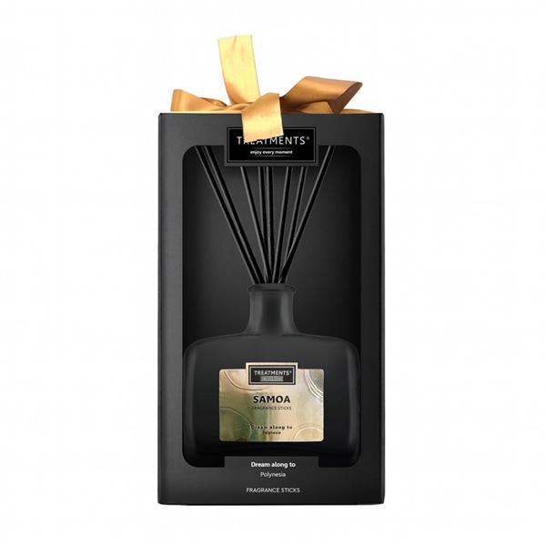 Patyczki zapachowe TREATMENTS, 200 ml, zapakowane w elegancki kartonik, zapach patyczków wypełni wnętrze domu ciepłem i niepowtarzalnym aromatem, dostępne różne warianty zapachowe: 03 – Ceylon, 06 – Mahayana, 08 – Omani, 11 – Uyuni, 16 – Zhejinag, 19 – Shinshiro, 21 – Verona, 98 – Samoa. Znakowanie produktu jest możliwe tylko na srebrnej lub złotej folii z czarnym nadrukiem albo na czarnej apli ze srebrnym lub złotym nadrukiem.