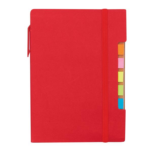 Notes PENZ poręczny, z zaokrąglonymi rogami, zawiera długopis wykonany z tektury (czarny tusz), posiada elastyczną, dopasowaną kolorystycznie gumkę do zamykania, 70 stron, gramatura ok. 70 g/m2, 5 różnokolorowych etykiet samoprzylepnych, wykonany z materiałów nadających się do recyklingu. Materiał: Papier Kolor: czerwony Tagi: notebooki,akcesoria biurowe