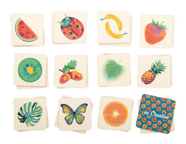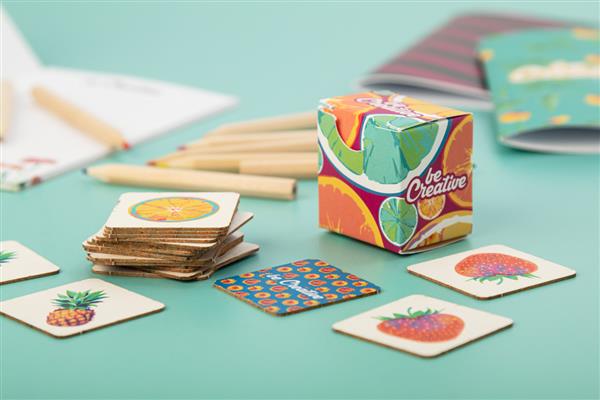 Description: Kartonowa gra memory z motywami tematycznymi w papierowym pudełku. Z 24 płytkami (40×40 mm). Cena obejmuje 12 różnych pełnokolorowych nadruków z przodu płytek, 1 kolorowy nadruk z tyłu wszystkich płytek oraz pudełko z nadrukiem w full kolorze. Min. ilość: 250 szt. Primary Color: naturalny Material 1: Karton Material 2: Papier Rozmiar: 35×42×42 mm