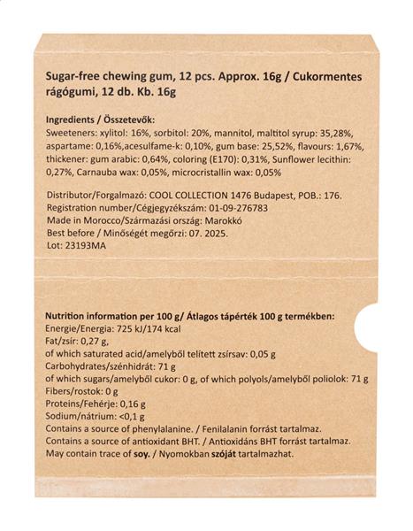 Description: 12 sztuk bezcukrowej gumy do żucia w blistrze z wykonanym na zamówienie, zadrukowanym w pełnym kolorze papierowym etui. MOQ: 100 szt. Primary Color: naturalny Material 1: Papier Rozmiar: 105×63×6 mm