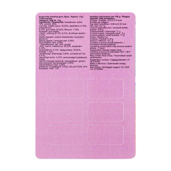 6 gum do żucia bez cukru w blistrze z perforowaną, zadrukowaną w full kolorze kopertą papierową. Min. ilość: 100 szt.