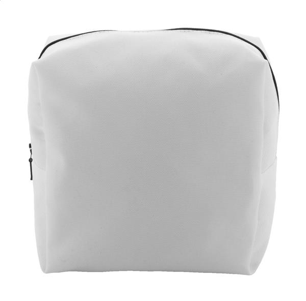 Description: Personalizowana kwadratowa kosmetyczka z zamkiem, wykonana z poliestru 600D RPET. Z nadrukowaną grafiką sublimacyjną na całej powierzchni. Min. ilość: 50 szt. Primary Color: czarny Secondary Color: biały Material 1: 600D Poliester z recyklingu PET Rozmiar: 180×180×90 mm