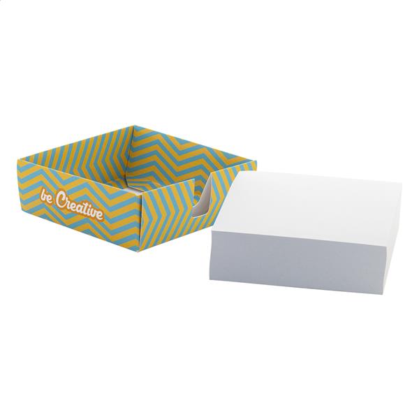 Wykonany na zamówienie dozownik z papieru na karteczki na notatki z 300-arkuszowym blokiem karteczek z papieru z recyklingu (90×90 mm). Cena obejmuje full kolorowy nadruk na uchwycie. Min. ilość: 100 szt.