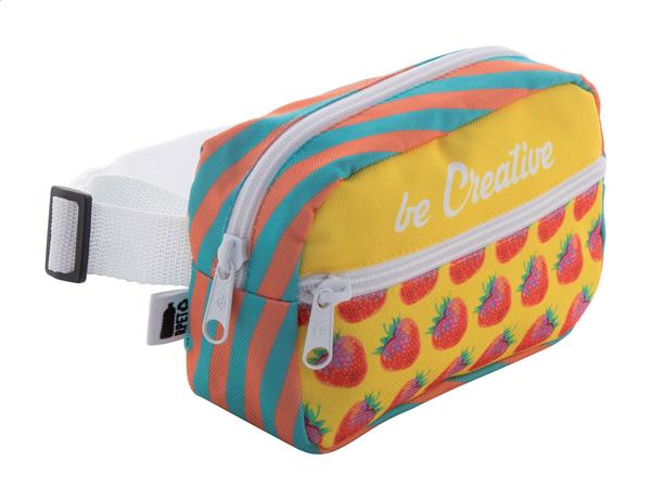 Description: Personalizowana torba biodrowa z przegrodą zapinaną na zamek i przednią kieszenią, poliester 600D RPET. Z nadrukowaną grafiką sublimacyjną na całej powierzchni i charakterystyczną metką RPET. Min. ilość: 25 szt. Primary Color: biały Material 1: 600D Poliester z recyklingu PET Metka: Z metką Pojemność torby: 0.5 l Rozmiar: 170×130×70 mm