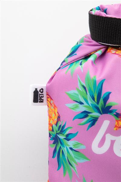 Wykonana na zamówienie, duża, wielokrotnego użytku torba na chleb typu rolltop z poliestru RPET 190T z wytrzymałą, wodoodporną podszewką. Z nadrukowaną grafiką sublimacyjną na całej powierzchni i charakterystyczną metką RPET. Min. ilość: 25 szt.