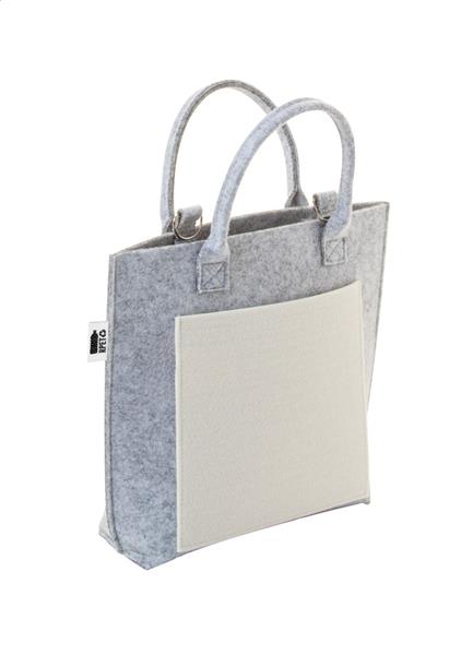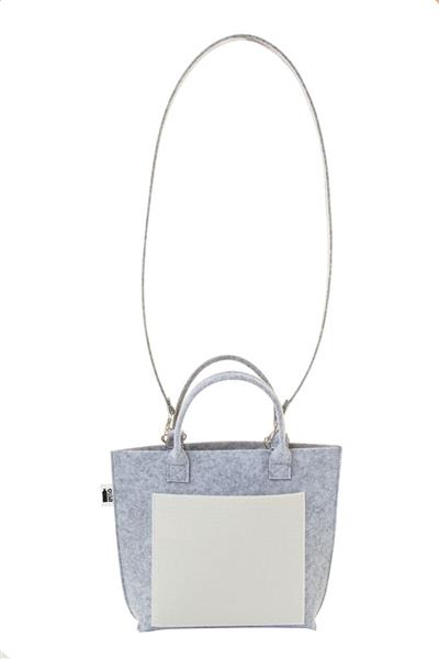 Description: Personalizowana, filcowa torba damska RPET z przednią kieszenią z nadrukiem w full kolorze. Z krótkimi uchwytami, odpinanym paskiem na ramię i charakterystyczną metką RPET. Cena zawiera nadruk sublimacyjny. Min. ilość: 25 szt. Primary Color: biały Secondary Color: szary Metka: Z metką Material 1: Filc PET z recyklingu Rozmiar: 270×300×70 mm