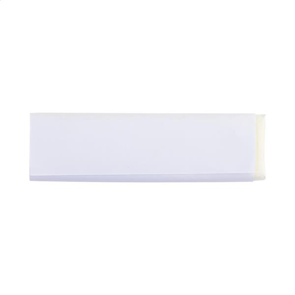 Jedno opakowanie prostokątnych cukierków o smaku mieszanych owoców (7,5 grama) wykonanych na zamówienie, z full kolorową, zadrukowaną kopertą papierową. Min. ilość: 100 szt. Primary Color: biały Material 1: Papier Rozmiar: 61×9×15 mm
