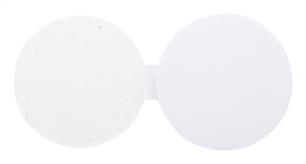 Description: Okrągły, wykonany na zamówienie, notatnik z papieru nasiennego. Zawiera 50 arkuszy samoprzylepnych notatek z papieru pochodzącego z recyklingu. Cena obejmuje okładkę zewnętrzną z nadrukiem w full kolorze. Min. ilość: 100 szt. Z różnymi nasionami dzikich kwiatów. Primary Color: biały Material 2: Papier z recyklingu Material 1: Papieru nasiennego Rozmiar: o75×6 mm