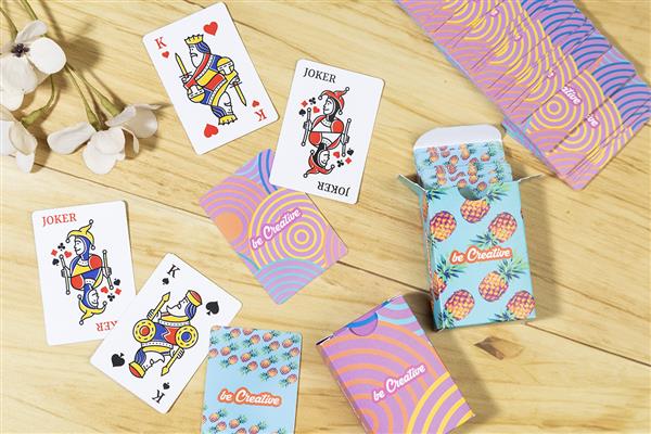 Klasyczne karty do gry w formacie mini, wykonane na zamówienie, w papierowym pudełku. Jedna standardowa talia z 54 kartami. Cena obejmuje pudełko z full kolorowym nadrukiem oraz identyczny kolorowy nadruk na odwrocie każdej karty. Min. ilość: 100 szt.