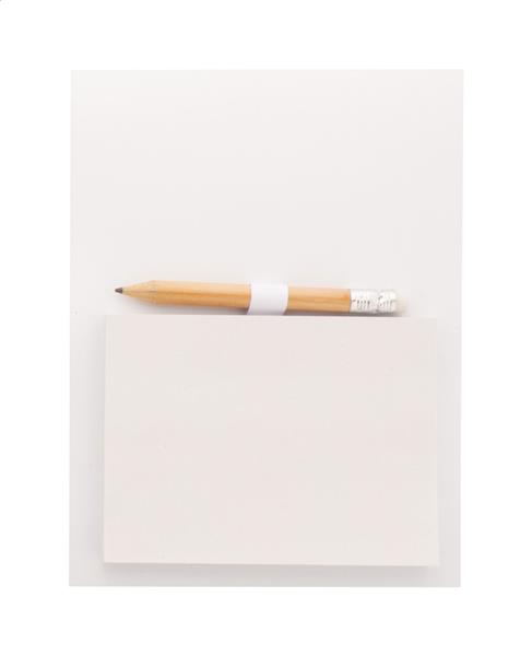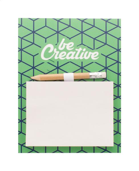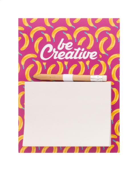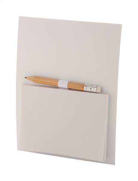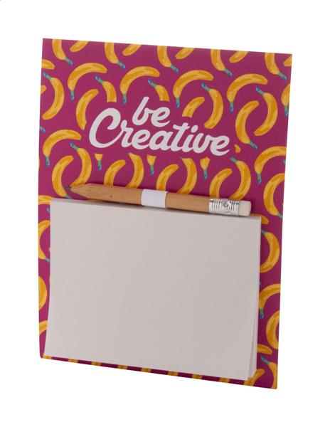 Description: Personalizowana magnes na lodówkę z nadrukiem w full kolorze z notatnikiem samoprzylepnym oraz ołówkiem. Zawiera 50 arkuszy karteczek samoprzylepnych z makulatury (75×75 mm). Min. ilość: 100 szt. Primary Color: biały Material 1: Drewno Rodzaj długopisy: Ołówek Material 2: Papier z recyklingu Rozmiar: 120×160×10 mm