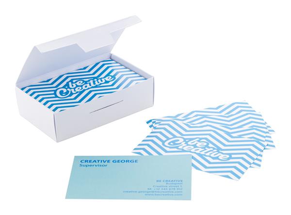 100 szt. wizytówek papierowych, wodoodpornych i odpornych na rozdarcia, z grafiką w full kolorze po obu stronach. W białym pudełku papierowym. Podana cena dotyczy jednego pudełka wizytówek zawierającego 100 szt.