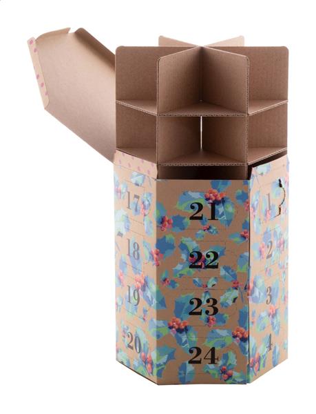 Personalizowany, zadrukowany w full kolorze sześciokątny kalendarz adwentowy z papieru kraft z 24 przegródkami. Dostarczany na płasko, bez słodyczy. Min. ilość: 50 szt.