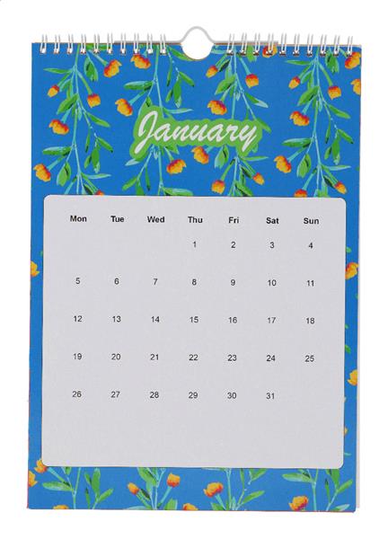 Kalendarz ścienny w formacie A4, oprawiony spiralnie, wykonany na zamówienie, z full kolorową grafiką i haczykiem do zawieszania. Zawiera 6 dwustronnych arkuszy miesięcznych i okładkę. Cena zawiera nadruk cyfrowy na wszystkich stronach. Min. ilość: 100 szt.
