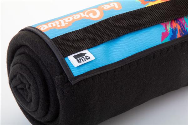 Description: Personalizowany koc z polaru RPET (200 g/m2) z uchwytem na rzep, z poliestru 600D RPET. Z nadrukiem sublimacyjnym i charakterystyczną metką RPET. Min.ilość: 25 szt. Primary Color: czarny Gramatura 2: 200 g/m2 Material 2: Polar Material 1: PET z recyklingu Material 3: 600D Poliester z recyklingu PET Rozmiar: 1200×1500 mm Metka: Z metką