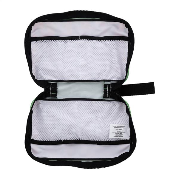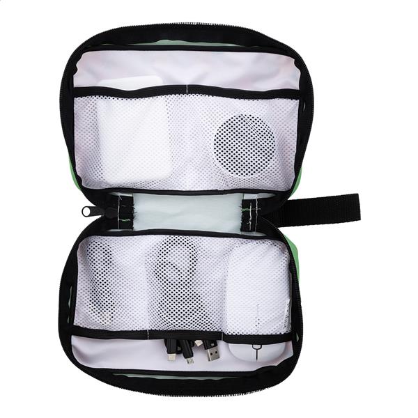 Wykonany na zamówienie, zapinany na zamek organizer na kable z RPET z przegródkami z siatki. Z nadrukowaną grafiką sublimacyjną na całej powierzchni. Poliester 600D RPET z charakterystyczną metką RPET. Min. ilość: 25 szt.