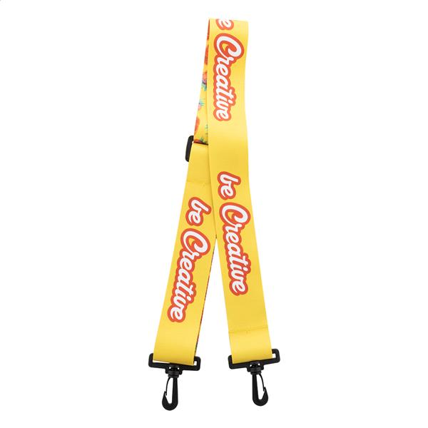 Wykonany na zamówienie, regulowany na długość poliestrowy pasek na ramię z plastikowymi karabińczykami. Z nadrukowaną grafiką sublimacyjną po obu stronach. Nadaje się do toreb na ramię, teczek na dokumenty lub toreb sportowych. Min. Ilość: 50 szt.