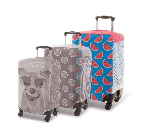 Personalizowany, poliestrowy pokrowiec na bagaż zapinany na rzep. Pasuje do dużych walizek o wymiarach do 50x70x30 cm. Z grafiką sublimacyjną na całej powierzchni. Min. ilość: 25 szt.