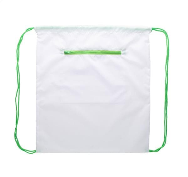 Description: Personalizowany worek ze sznurkiem z zapinaną na zamek przednią kieszenią z ochroną RFID, poliester 190T. Z nadrukowaną grafiką sublimacyjną na całej powierzchni. Min. ilość: 25 szt. Primary Color: zielony Material 1: 190T poliester Rozmiar: 370×425 mm