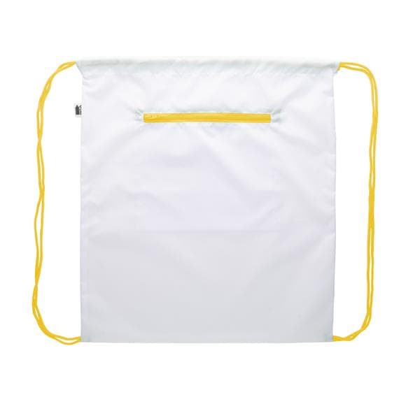 Description: Personalizowany worek ze sznurkiem z zapinaną na zamek przednią kieszenią z ochroną RFID, poliester 190T. Z nadrukowaną grafiką sublimacyjną na całej powierzchni. Min. ilość: 25 szt. Primary Color: żółty Rozmiar: 370×425 mm Material 1: 190T pongee z recyklingu PET