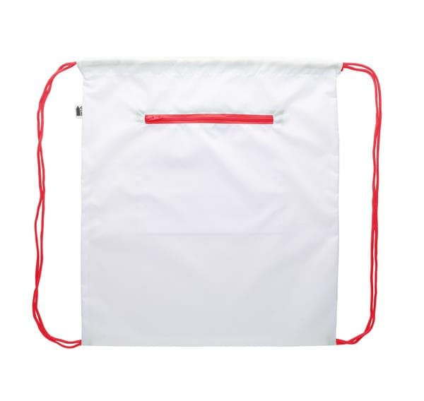 Description: Personalizowany worek ze sznurkiem z zapinaną na zamek przednią kieszenią z ochroną RFID, poliester 190T. Z nadrukowaną grafiką sublimacyjną na całej powierzchni. Min. ilość: 25 szt. Primary Color: czerwony Rozmiar: 370×425 mm Material 1: 190T pongee z recyklingu PET