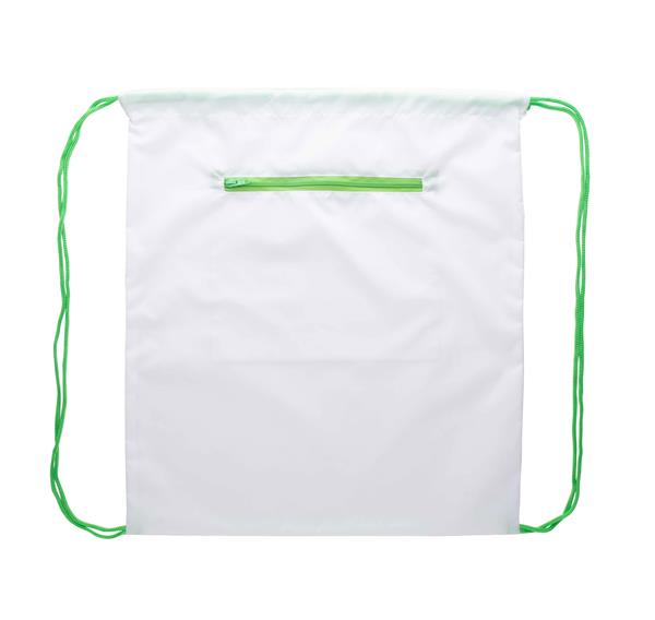 Description: Personalizowany worek ze sznurkami z zamkiem na froncie, 190T poliester. Z nadrukiem sublimacyjnym na całości. Min. ilość: 25szt. Primary Color: zielony Secondary Color: biały Material 1: 190T poliester Rozmiar: 370×425 mm