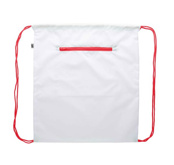 Description: Personalizowany worek ze sznurkami z zamkiem na froncie, 190T poliester RPET. Z nadrukiem sublimacyjnym na całości. Z metką RPET. Min. ilość: 25szt. Primary Color: czerwony Secondary Color: biały Material 1: 190T poliester Rozmiar: 370×425 mm