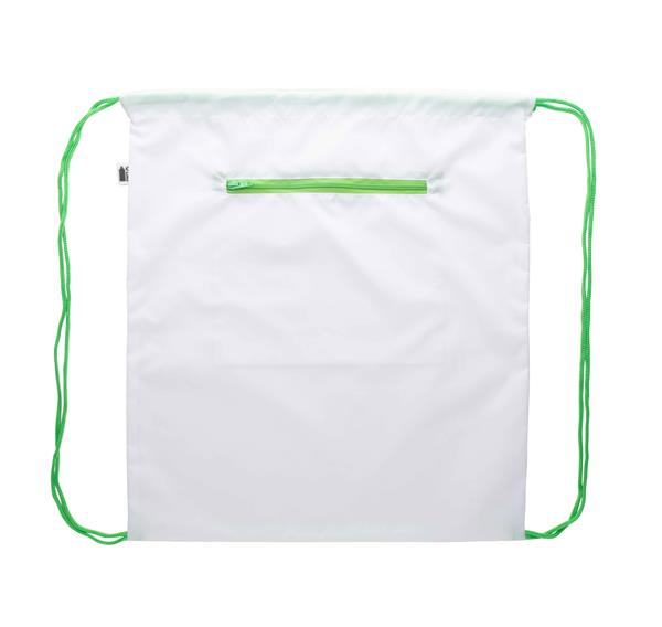 Description: Personalizowany worek ze sznurkami z zamkiem na froncie, 190T poliester RPET. Z nadrukiem sublimacyjnym na całości. Z metką RPET. Min. ilość: 25szt. Primary Color: zielony Secondary Color: biały Material 1: 190T poliester Rozmiar: 370×425 mm