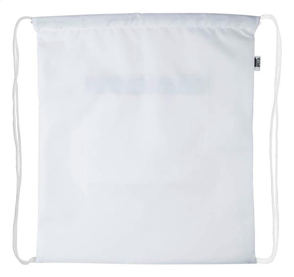 Description: Personalizowany worek ze sznurkami z zamkiem na froncie, 190T poliester RPET. Z nadrukiem sublimacyjnym na całości. Z metką RPET. Min. ilość: 25szt. Primary Color: biały Material 1: 190T poliester Rozmiar: 370×425 mm