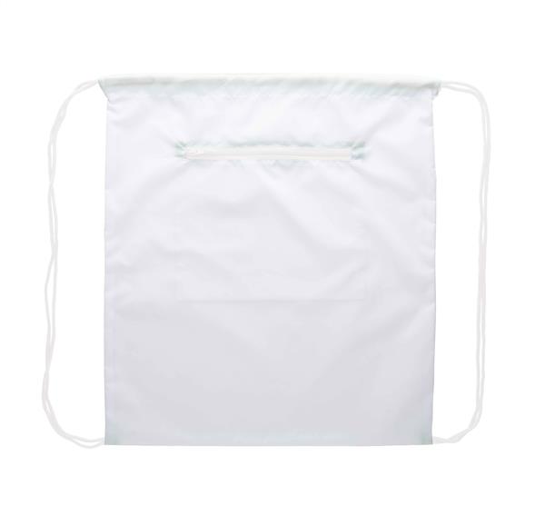 Description: Personalizowany worek ze sznurkami z zamkiem na froncie, 190T poliester. Z nadrukiem sublimacyjnym na całości. Min. ilość: 25szt. Primary Color: biały Material 1: 190T poliester Rozmiar: 370×425 mm