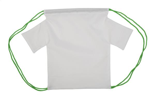 Description: Personalizowany worek ze sznurkami dla dzieci w kształcie koszulki, poliester 190T. Z nadrukowaną grafiką sublimacyjną. Min. ilość: 25 szt. Primary Color: zielony Material 1: 190T poliester Rozmiar: 430×320 mm Pojemność torby: 9.2 l