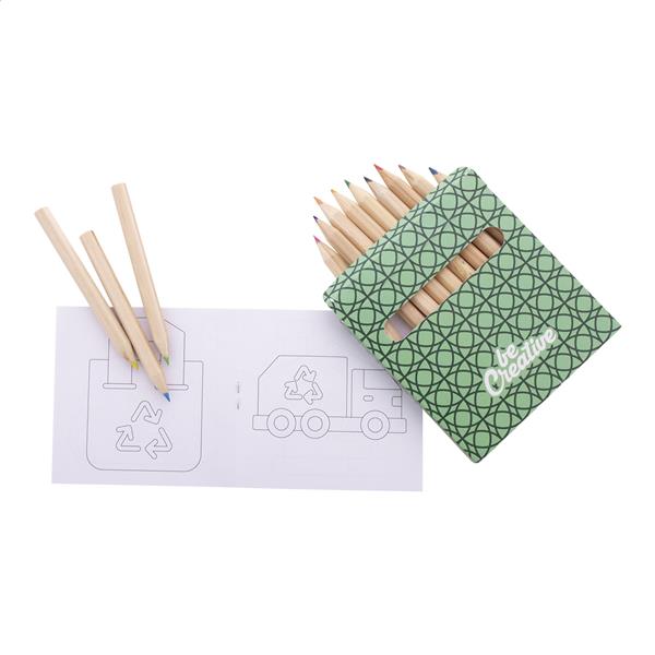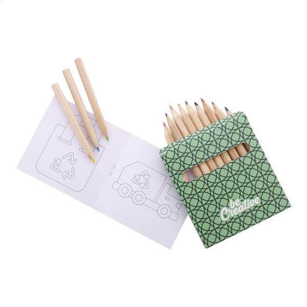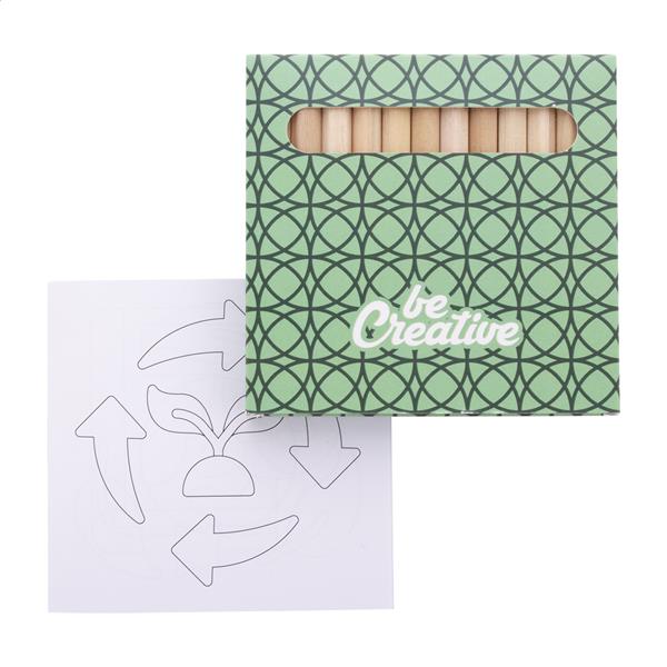 Personalizowany, zestaw do kolorowania w full kolorowym papierowym pudełku. W zestawie drewniane kredki (12 szt.) i tematyczna książeczka do kolorowania. Min. ilość: 100 szt.