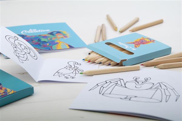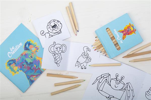 Personalizowany, zestaw do kolorowania w full kolorowym papierowym pudełku. W zestawie drewniane kredki (12 szt.) i tematyczną książeczką do kolorowania. Min. ilość: 100 szt.