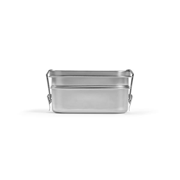 Ten pochodzący z recyklingu pojemnik na lunch z satynowej stali jest wielozadaniowy i ma pojemność 1240 ml (1050 ml netto). Zabezpieczony bocznymi klamrami, pomieści lunch do pracy lub najnowsze danie kulinarne na piknik. Podwójne przegródki zapraszają do degustacji – z jednej strony sushi, z drugiej sałatki.